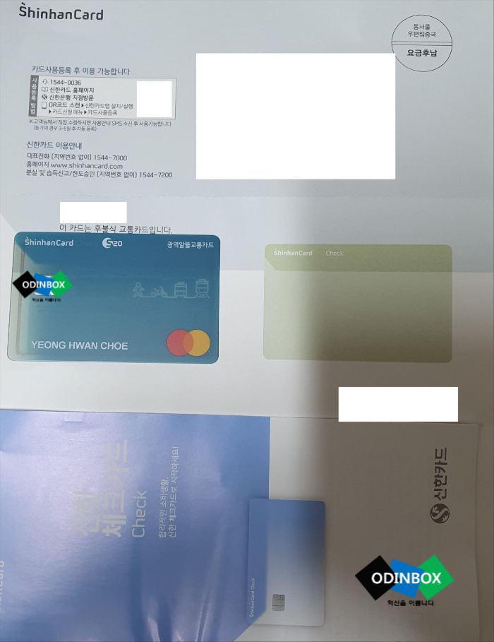 이런 식으로 다른 신용카드나 체크카드와 비슷하게 옵니다, 어서 빨리 봉투를 뜯고 내용물을 확인을 합니다. 큰 종이의 내용도 대충 한번 쓱 눈으로 보고 한쪽으로 치웁니다. 카드의 디자인을 보니, 홈페이지의 카드 디자인과는 조금 다르게 되어있습니다. 차라리 홈페이지에 있는 카드 디자인으로 심플하게 해주시지 회원가입 할 때, 광역알뜰교통카드에 적혀있는 카드번호 등록 후 사용하면 됩니다.