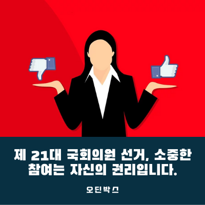 우리가 만드는 대한민국, 4월 15일은 제 21대 국회의원을 뽑는 선거가 있는 날 ! 이 날은 모든 분들이 참여하셔서 꼭 소중한 자신의 한표를 할 수 있도록 많은 분들이 참여할 수 있길 바랍니다. 사전 투표율도 26.7%로 집계가 되었습니다 2016년에 열렸던 제20대 국회의원 선거 당시에는 58%의 투표율을 보였습니다 이번 선거에는 한 분도 빠짐없이 모두 참여하셔서 소중한 여러분의 권리를 행사하실 수 있길 바랍니다. 선거 관련 정보 간단하게 알려드릴겠습니다.