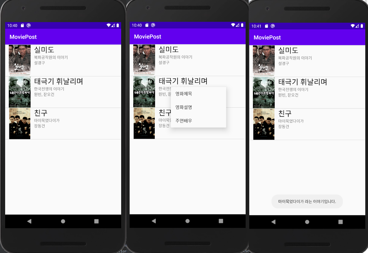 이번에는 저번에 만들었던 MoviePost와 흡사하지만 Context등을 활용하여, 영화소개 어플을 간단하게 만들어보았습니다. 기존의 MoviePost와 비슷하지만 기능이 추가되어져있습니다.