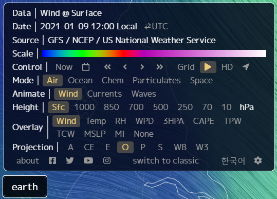 그리고, 아래에 earth를 누르면 다양한 옵션들을 설정 할 수 있습니다. 기후, 해수면, 오로라, 화학물질, 해류, 에어로졸등 여러가지 정보를 볼 수 있고 향후 날씨를 예측해서 볼 수 가 있습니다.