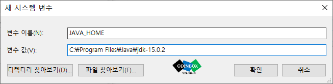 변수 값 : C:\Program Files\Java\jdk-15.0.2 [자바 설치 버전에 따라 설치 경로에 따라 달라질 수 있음]