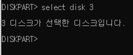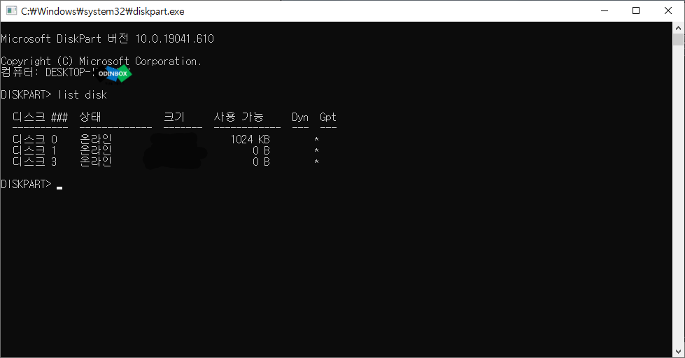 list disk를 입력하면 해당 컴퓨터에 연결이 된 디스크 목록이 보이게 됩니다.
