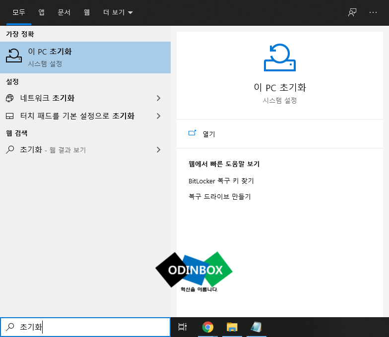작업 표시줄에서 검색 부분을 클릭 후 초기화라고 입력을 하면 사진과 같이 "이 PC 초기화"라는 것이 나옵니다. 해당 부분을 클릭합니다.
