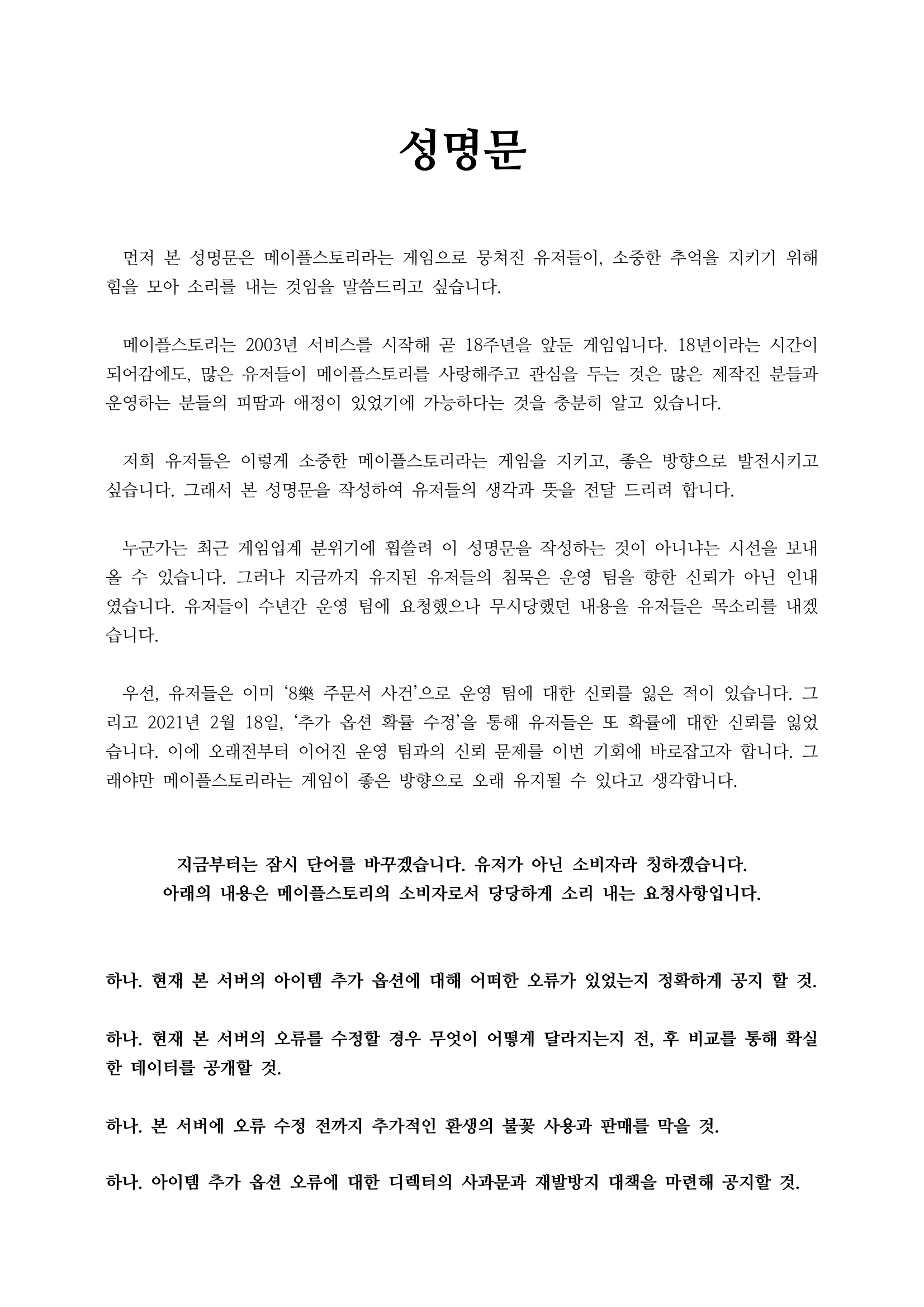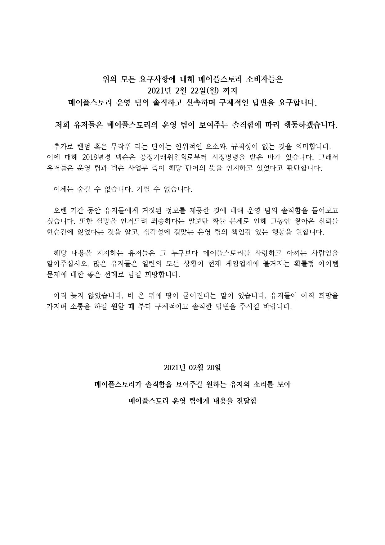 메이플은 사과문으로 잠잠해질 것을 기대를 했을지 모르지만 전혀 그렇지 않았다 유저들은 더욱 분노하며 급기야 메이플 커뮤니티인 메이플 인벤에는 2월 19일 사과문을 본 유저들은 성명서와 함께 서명운동을 진행하는 글이 올라왔다. [링크]