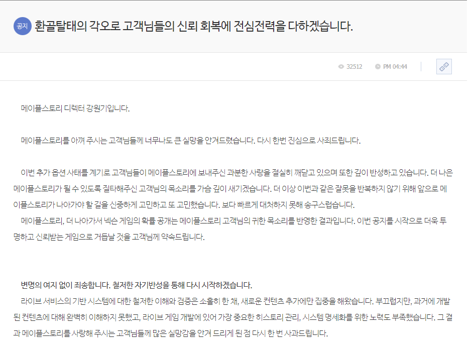 드디어 오후 4시 44분 총 세 개의 글이 올라왔고 그중 첫 번째인 "환골탈태의 각오로 고객님들의 신뢰 회복에 전심전력을 다하겠습니다."[#] 공지사항이 올라오게 된다. 내용은 다시 한번 머리를 깊게 숙이고 시작하고 확률형 시스템을 보완한다는 글이 올라왔고 공개를 한다는 말이 올라왔다. 실시간 모니터링 시스템이라는 것을 도입을 한다는 것과 함께 토론게시판의 의견들에 귀 기울인다는 것을 말했다.