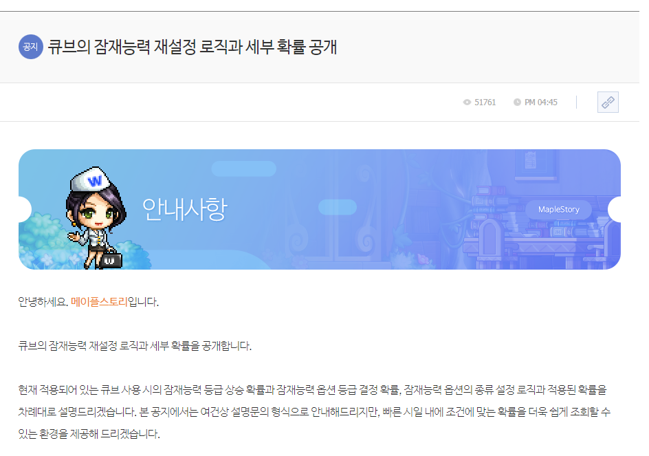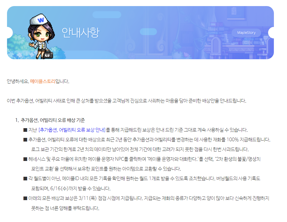 3월 5일까지 추가 옵션 시스템 개편과 함께 어빌리티 오류로 발생한 피해 배상안에 대한 전면 재검토, 유저들의 추가적인 보상과 함께 큐브 확률 공개 등 메이플스토리의 정보/기록들을 공개한다고 하였고 그 글이 올라오게 되었다 아래의 내용을 참고하면 된다.