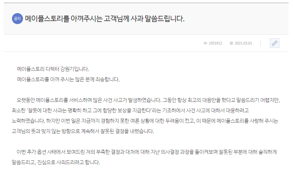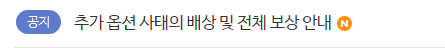 세 번째는 "추가 옵션 사태의 배상 및 전체 보상 안내"라는 내용으로 공지가 올라왔다 이번 보상안이 유저들이 가장 많이 관심을 가지고 있었던 글이었다.[#]