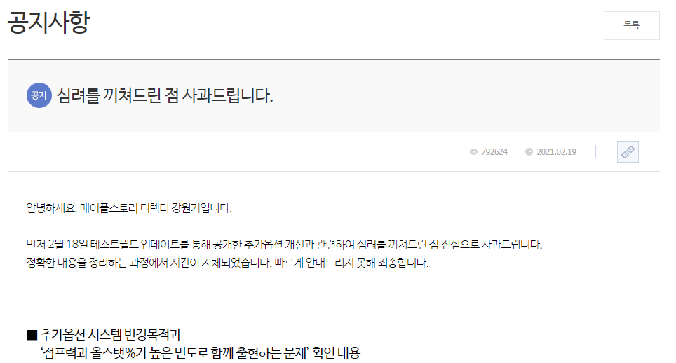 2021년 02월 18일 넥슨 메이플스토리 공지사항에 추가 옵션 확률 균일화 패치를 테스트 서버 패치노트에 공지[링크]를 올리면서 유저들을 폭발하기 시작했다.