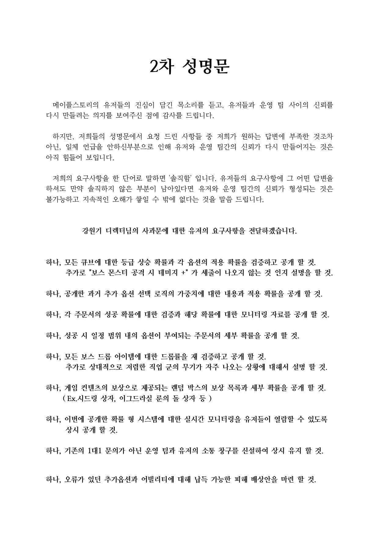 19일 사과문의 내용들을 본 유저들은 부족한 부분이 많다는 평가와 함께 다시 2차 성명을 2월 22일까지 요구를 하는 2차 성명문을 2월 20일 메이플 인벤에 올리게 되었다. [링크]