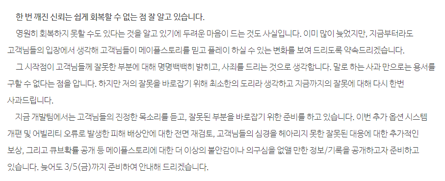 결국 2차 사과문이 3월 3일날 강원기 디렉터의 이름으로 올라왔다 [링크] 하지만 이미 유저들의 마음은 떠나 더 이상 붙잡을 수 없을지 모른다. 1차 사과문과는 다르게 2차 사과문은 저자세와 함께 감정에 호소하는 듯한 글인 것 같았다.