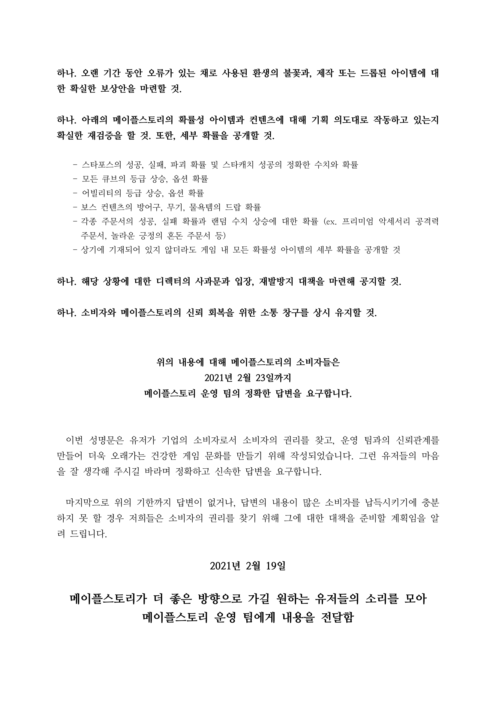 메이플은 사과문으로 잠잠해질 것을 기대를 했을지 모르지만 전혀 그렇지 않았다 유저들은 더욱 분노하며 급기야 메이플 커뮤니티인 메이플 인벤에는 2월 19일 사과문을 본 유저들은 성명서와 함께 서명운동을 진행하는 글이 올라왔다. [링크]