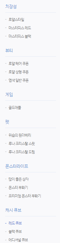 이미지를 보면 알겠지만 큐브(레드 큐브, 블랙 큐브, 에디셔널 큐브), 몬스터라이프(많이 좋은 상자, 몬스터 부화기, 프리미엄 몬스터 부화기), 펫(위습의 원더베리, 루나 크리스탈 스윗, 루나 크리스탈 드림), 게임(골드애플), 뷰티(로얄헤어 쿠폰, 로얄 성형, 염색 일반), 치장성(로얄스타일,마스터피스 레드,블랙) 확률이 나오게 된다.