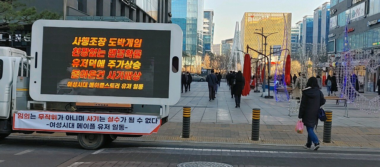 넥슨 본사와 국회를 중심으로 트럭 전광판에는 확률형 아이템과 넥슨의 책임 있는 자세를 바라는 유저들의 염원이 담겨 시위가 진행이 되었다 이 시위에는 남성향 커뮤니티들이 주로 진행이 되었던 것들이 메이플스토리는 타 게임보다 여성 유저도 많다 보니 여성향 커뮤니티인 여성시대도 참여를 하게 되며 서로 다른 성향의 커뮤니티들이 하나가 되어 이 문제를 비판하게 되었다.