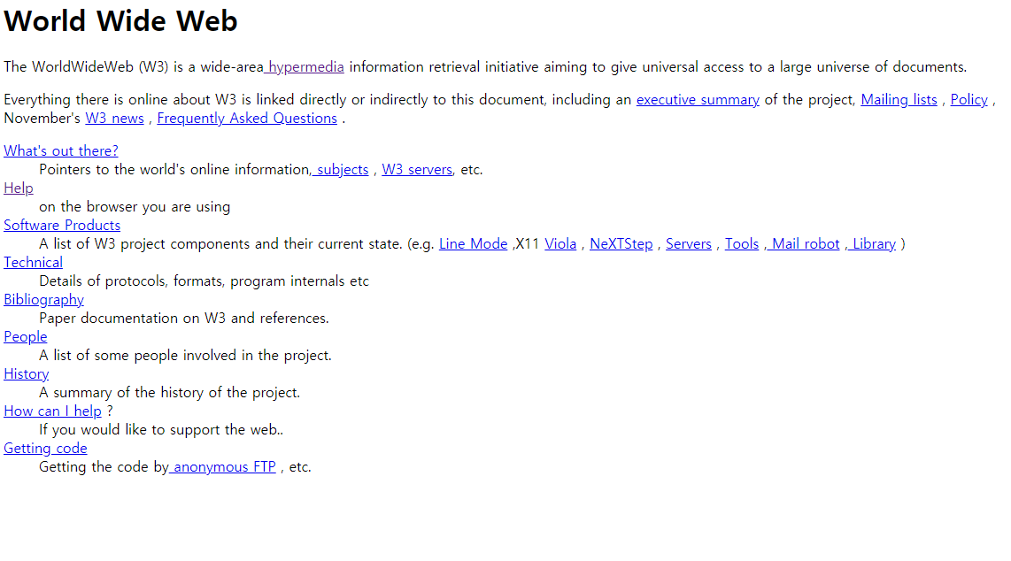 이에 여러 연구기관들이 흩어져있는 문서와 소리, 동영상 등을 체계화하여 전 세계의 대학 및 연구소들끼리의 상호 연구를 할 수 있게 하고 데이터베이스를 구축하여 전문 열람 소프트웨어로 열람하는 방식에 대해서 고안을 하게 되었는데 1989-03, 1990-05에 w3 개발과 함께 제안서와 함께 이후 웹 브라우저를 개발하게 됨으로 이후 WWW의 탄생하게 됩니다 하이퍼텍스트를 기반으로 문서들이 모아져 있고 이 문서들은 HTML로 작성이 되어 HTTP를 기본 프로토콜로 사용이 되었습니다.