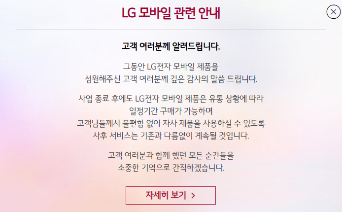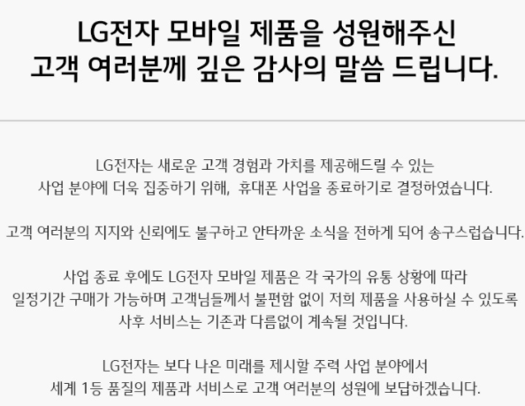 LG전자 모바일 제품을 성원해주신 고객 여러분께 깊은 감사의 말씀 드립니다 LG전자는 새로운 고객 경험과 가치를 제공해드릴 수 있는 사업 분야에 더욱 집중하기 위해, 휴대폰 사업을 종료하기