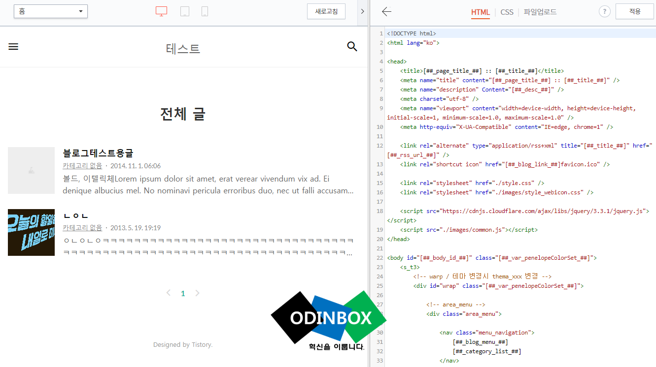 스킨편집 화면에서 오른쪽에 위치한 html 편집버튼을 누르면 위와 같이 화면이 이동이 되는 것을 확인할 수 있습니다.