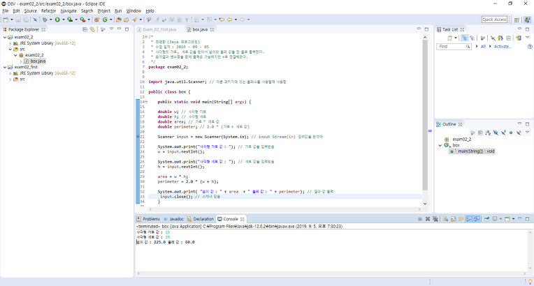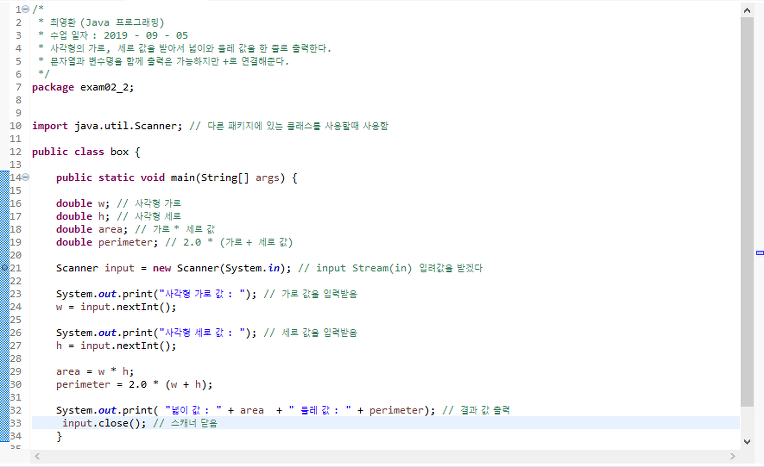 System.out.print( "넓이 값 : " + area + " 둘레 값 : " + perimeter); // 결과 값 출력
