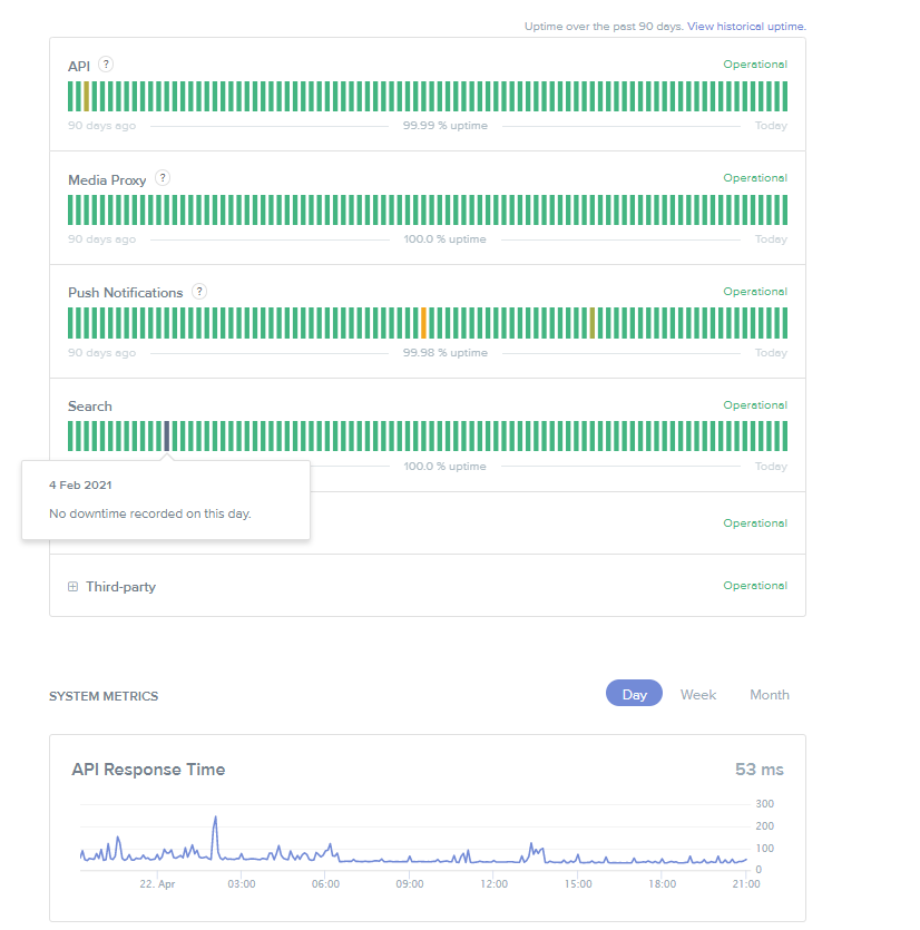 위에 것을 누른 후 스크롤하여 화면을 내리면 실시간 디스코드 상태에 대해서 알 수 있습니다. 혹시나 디스코드 이용 시 문제가 생긴다면 서버 상태도 꼭 확인해주시는 것이 좋습니다.