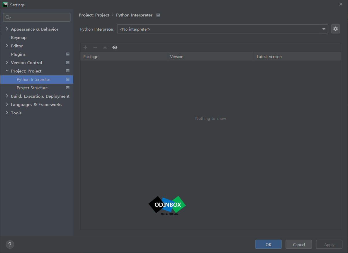 Settings 화면에서 Project: Project 메뉴에서 Python Interpreter로 이동합니다. 위와 같은 화면으로 이동이 되는 것을 알 수 있습니다.