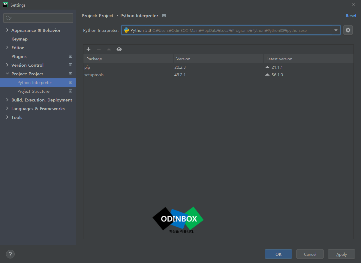 그리고, 다시 Settings로 나오게 되면 해당 화면과 같이 Python Interpreter에 파이썬 버전이 뜨면서 정상적으로 설정이 된 것을 확인할 수 있습니다. 하단 오른쪽 부분에 Apply를 누르고 Ok를 누릅니다.