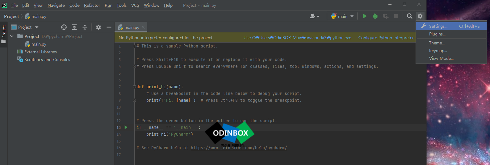 파이참 화면에서 상단 오른쪽 부분에 톱니바퀴 모양을 누른 후 Settings(Ctrl+Alt+S) 클릭합니다.