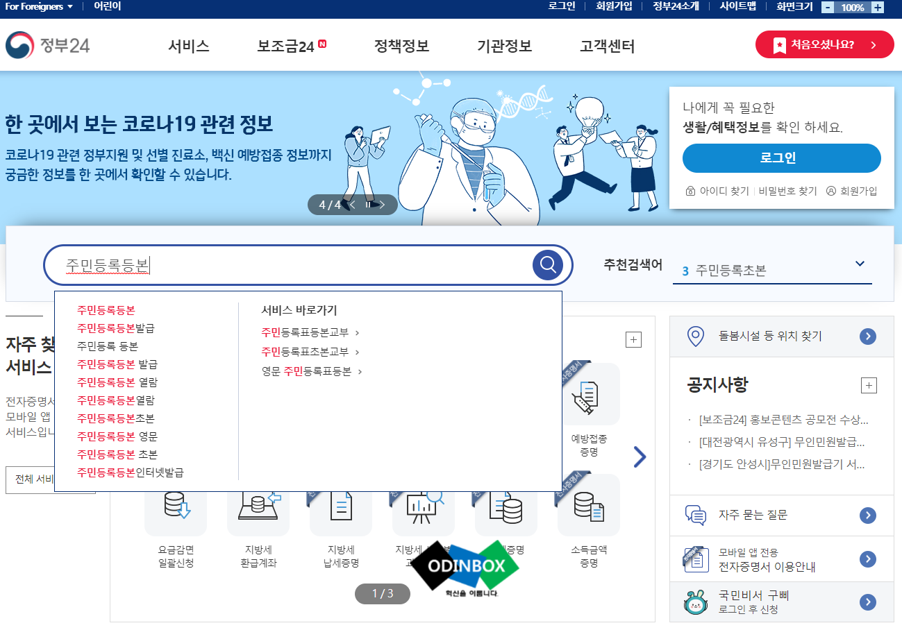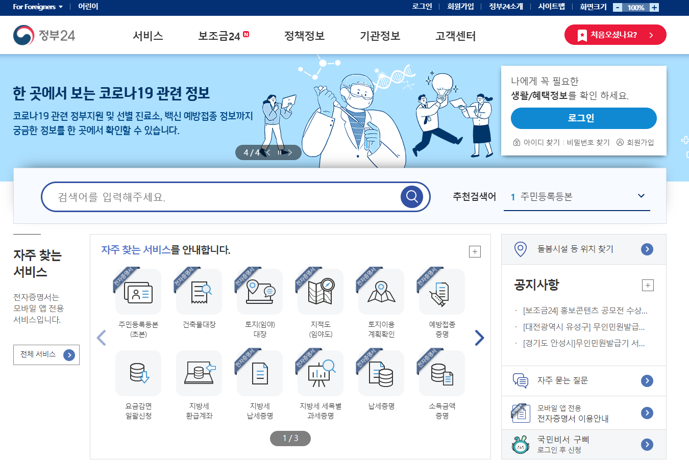 정부24로 접속을 하면 해당 메인 모습을 볼 수 있습니다.