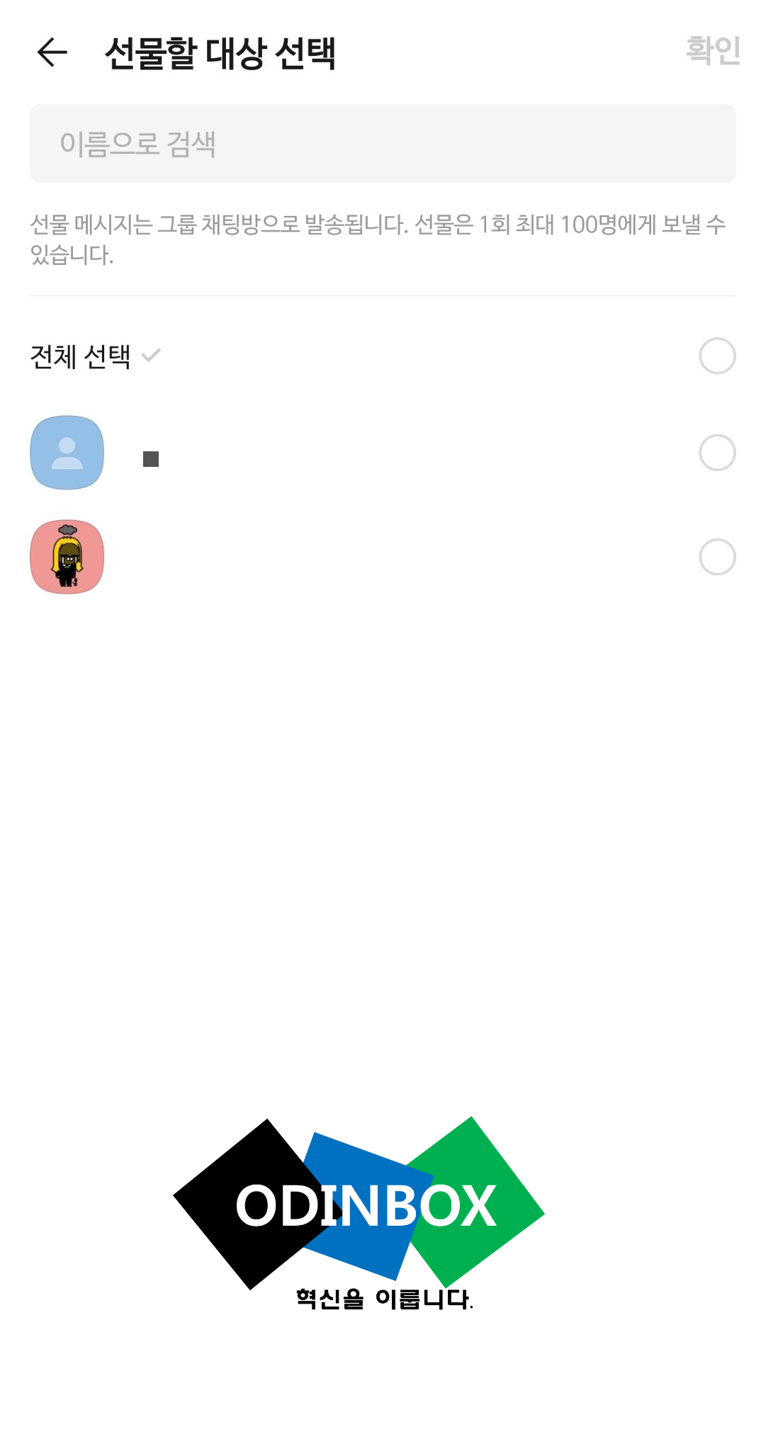 선물하기 화면에서 해당 선물 화면을 보면 하단에 선물하기를 누릅니다 그러면 해당 오픈채팅에 있는 유저 목록이 뜨는데 그 중 보내고 싶은 사람을 선택하고 보내면 됩니다 물론, 전체선택도 할 수 있습니다.