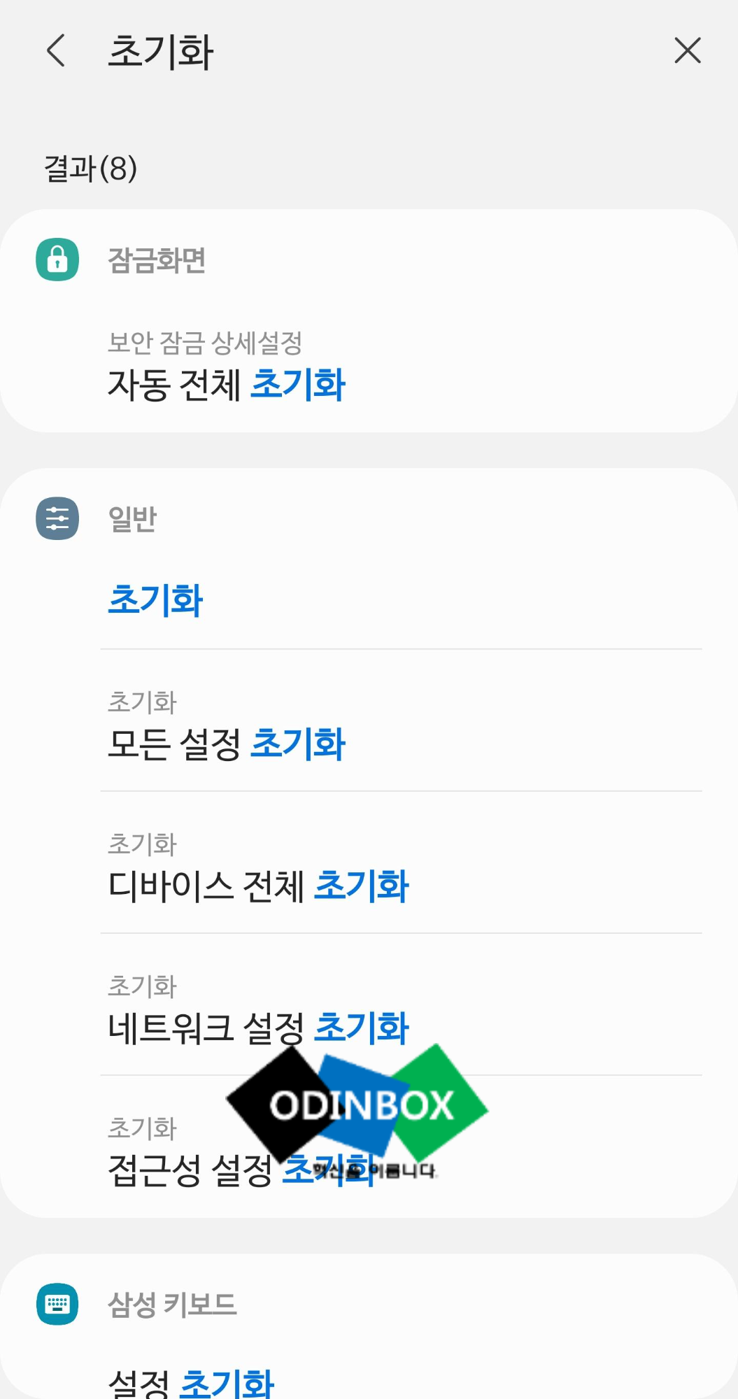 설정 화면에서 상단 돋보기 모양을 누르면 검색 화면으로 이동이 되는데 검색창에서 초기화라고 검색을 하게 되면 디바이스 전체 초기화와 함께 다양한 초기화 메뉴들이 나오는 것을 확인을 할 수 있습니다. 여기서 우리는 디바이스를 초기화를 해야 하는 것이므로 디바이스 전체 초기화를 누른 후 진행을 하면 됩니다.