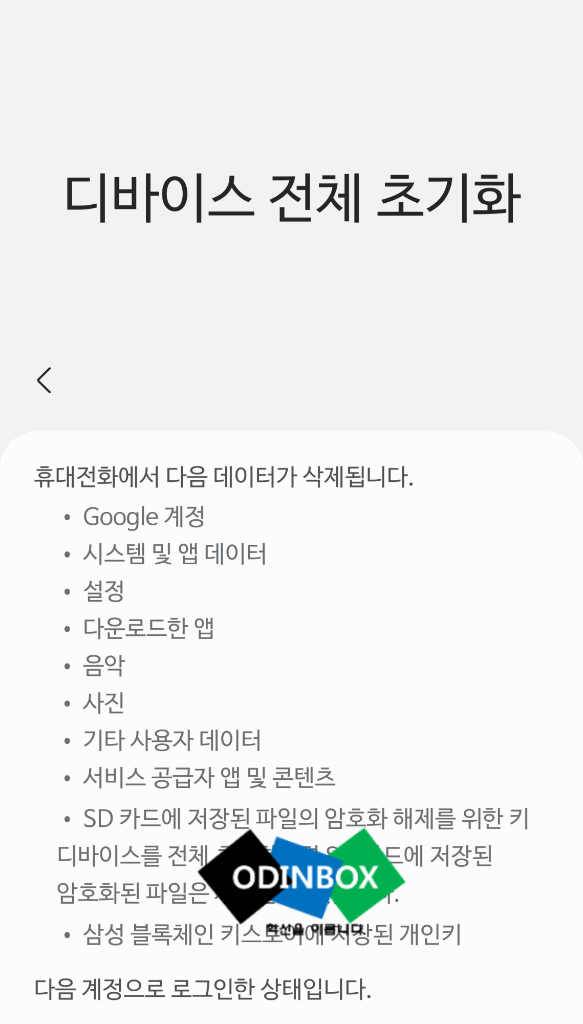 디바이스 전체 초기화로 들어가면 위와 같은 화면으로 이동합니다. 해당 기능을 이용하면 데이터[Google 계정, 시스템 및 앱 데이터, 설정, 다운로드한 앱, 음악, 사진, 기타 사용자 데이터, 서비스 공급자 앱 및 콘텐츠 등]들이 삭제가 되기 때문에 해당 데이터가 필요하다면 초기화 진행 전 백업이 필요합니다.