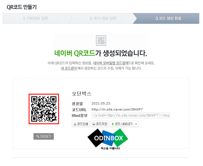 QR코드 만들기 화면으로 이동한 후 각 항목에 맞게 필요 정보를 입력한 후 다음단계를 누르면 됩니다. 저의 경우 오딘박스(Odinbox.co.kr)홈페이지로 이동하는 QR 코드를 만들어보도록 정보를 입력해보도록 하겠습니다.