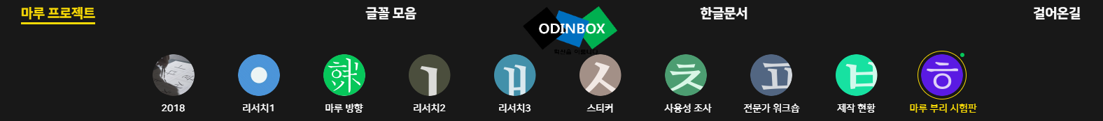 상단 오른쪽 목차 부분을 누르면 마루 프로젝트와 함께 글꼴 모음, 한글문서, 걸어온 길 등의 서비스와 소개가 있습니다. 우리가 흔히 알고 있는 나눔 고딕이나 이런 글씨체를 다운로드를 하려면 글꼴 모음을 누르면 됩니다.