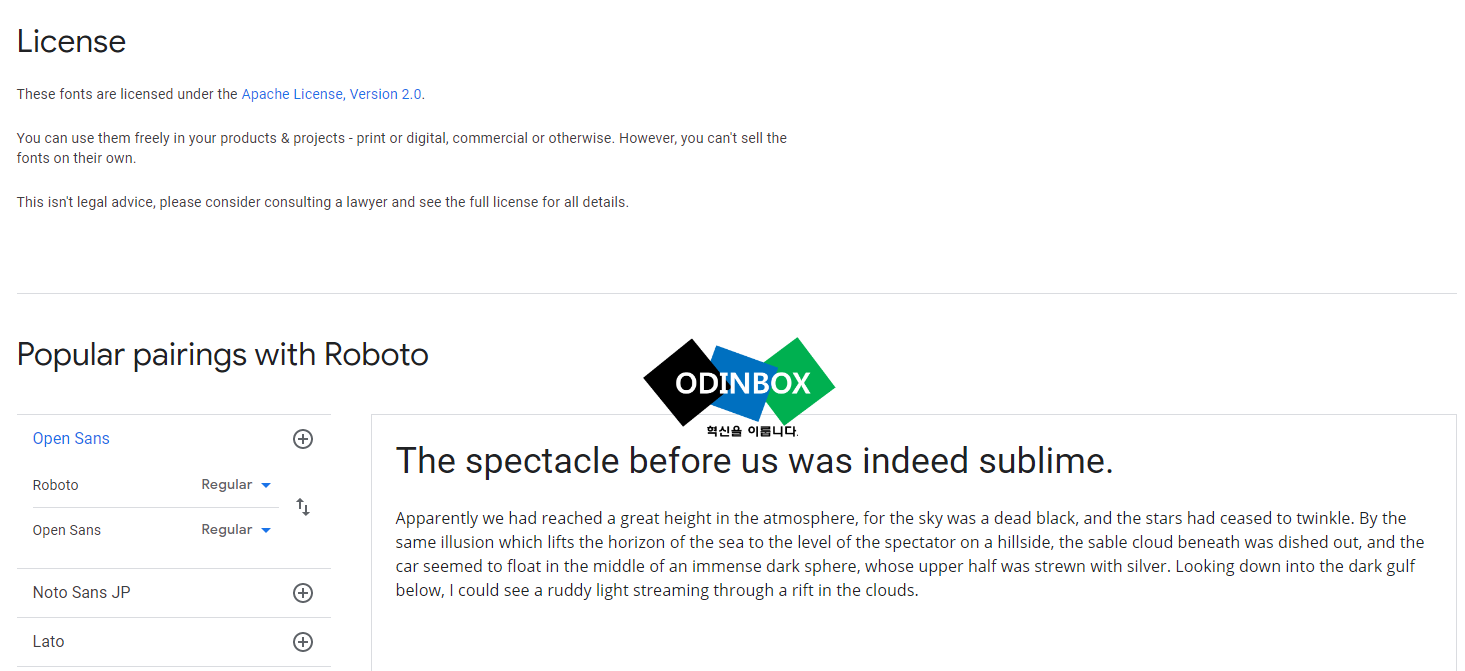 해당 폰트에 관련된 스타일과 자체와 소개 그리고, 라이선스 등을 소개하고 상단 오른쪽 부분을 보시면 다운로드할 수 있도록 지원을 하고 있습니다. 편하고 쓰기 쉬운 구글 폰트 소개였습니다.