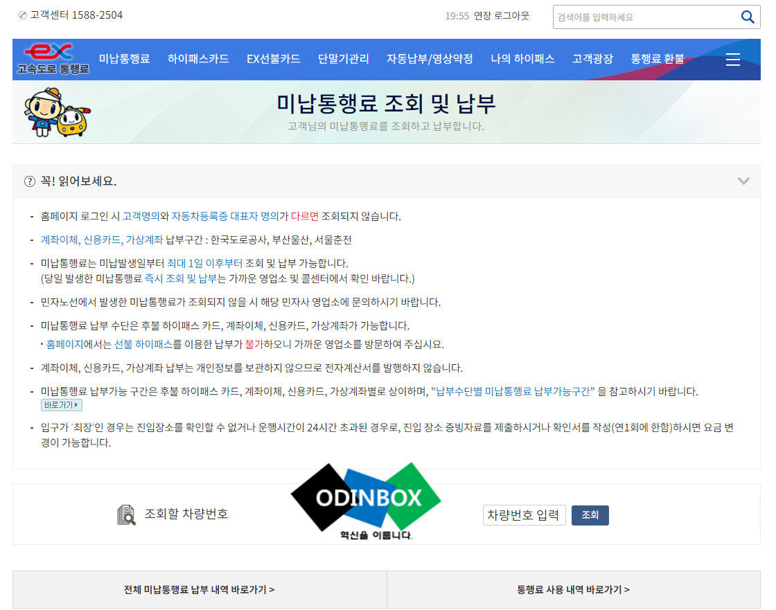한국도로공사에서 운영하는 고속도로 통행료 홈페이지[#]에 접속합니다. 보통은 미납 통행료가 있으면 한 달 정도 후 우편으로 고지서가 옵니다.