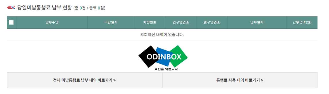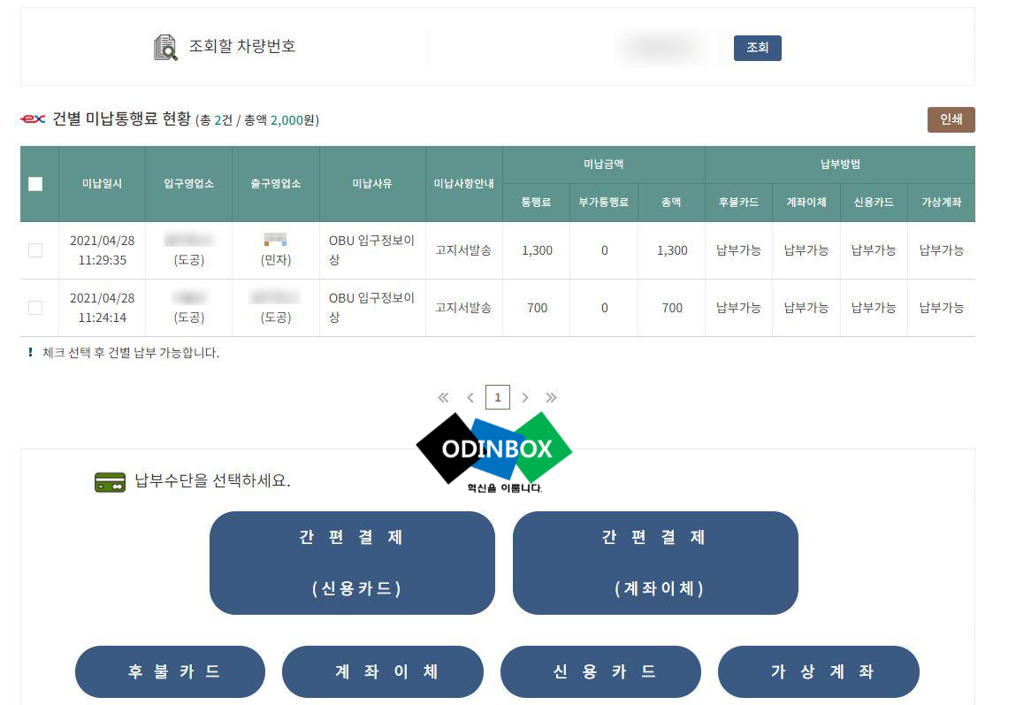 차량 번호를 넣고 조회를 누르면, 해당 차량의 미납 통행료가 목록으로 나타나는 것을 확인할 수 있습니다.