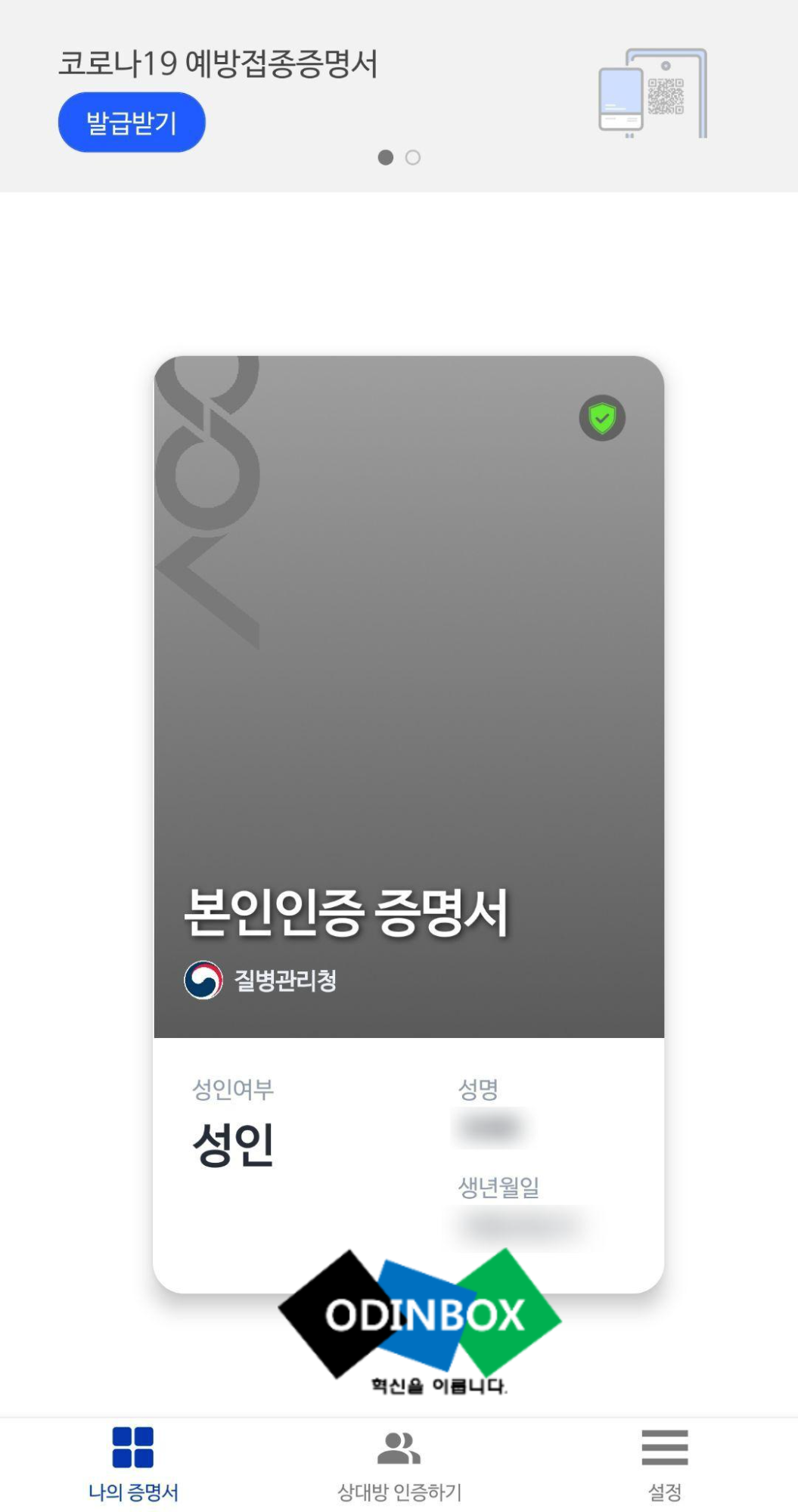 질병관리청과 (주)블록체인랩스에서 개발한 세계 최초 블록체인 기반의 코로나19 디지털 예방 접종 인증 앱입니다. 블록체인 기술을 이용해 디지털 증명서의 위변조를 불가능하게 하고, 증명