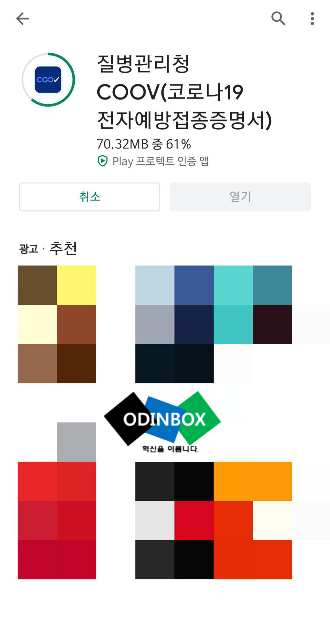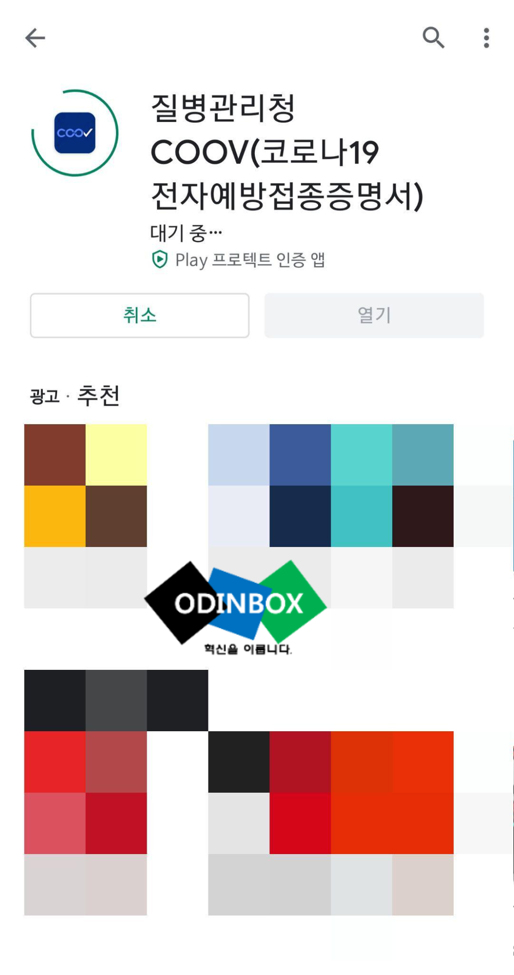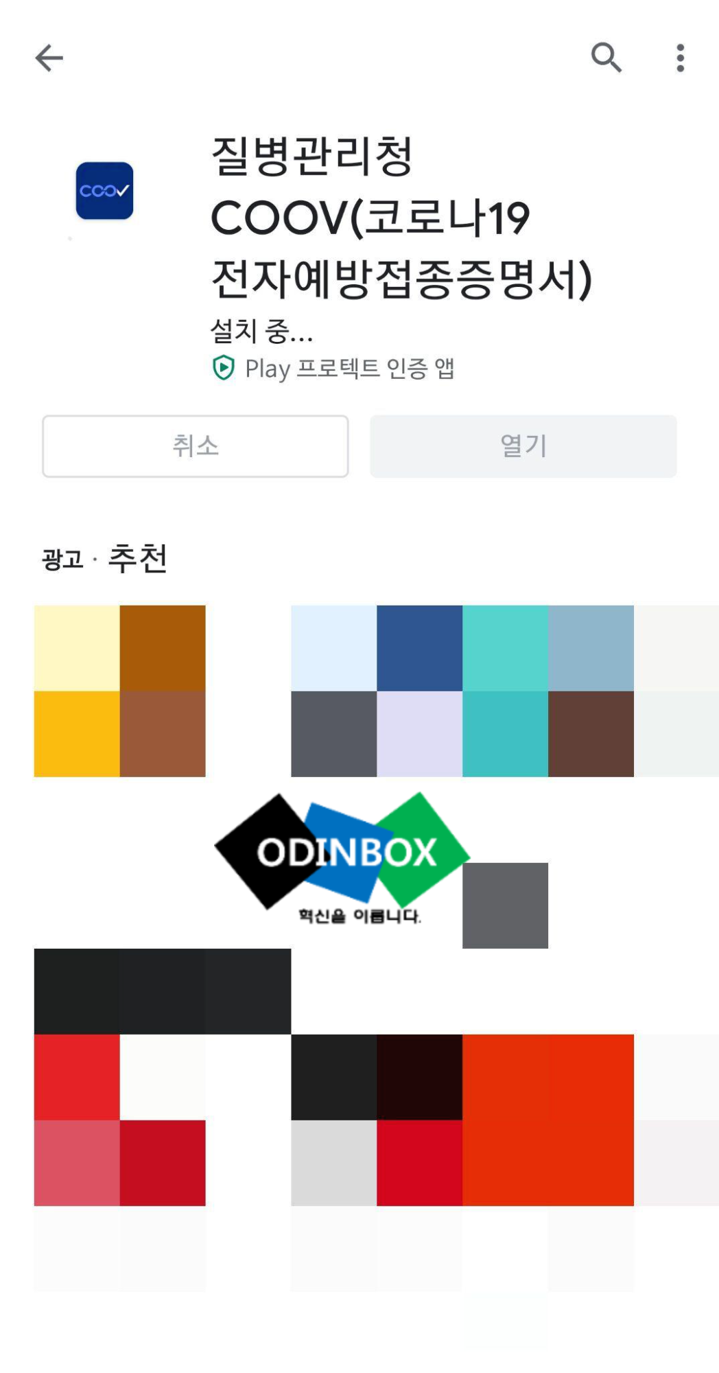 예를 들어 플레이스토어의 경우 검색창에 COOV 검색 후 사진상 보이는 어플을 눌러 설치를 누르면 정상적으로 다운로드 및 설치가 진행이 됩니다.