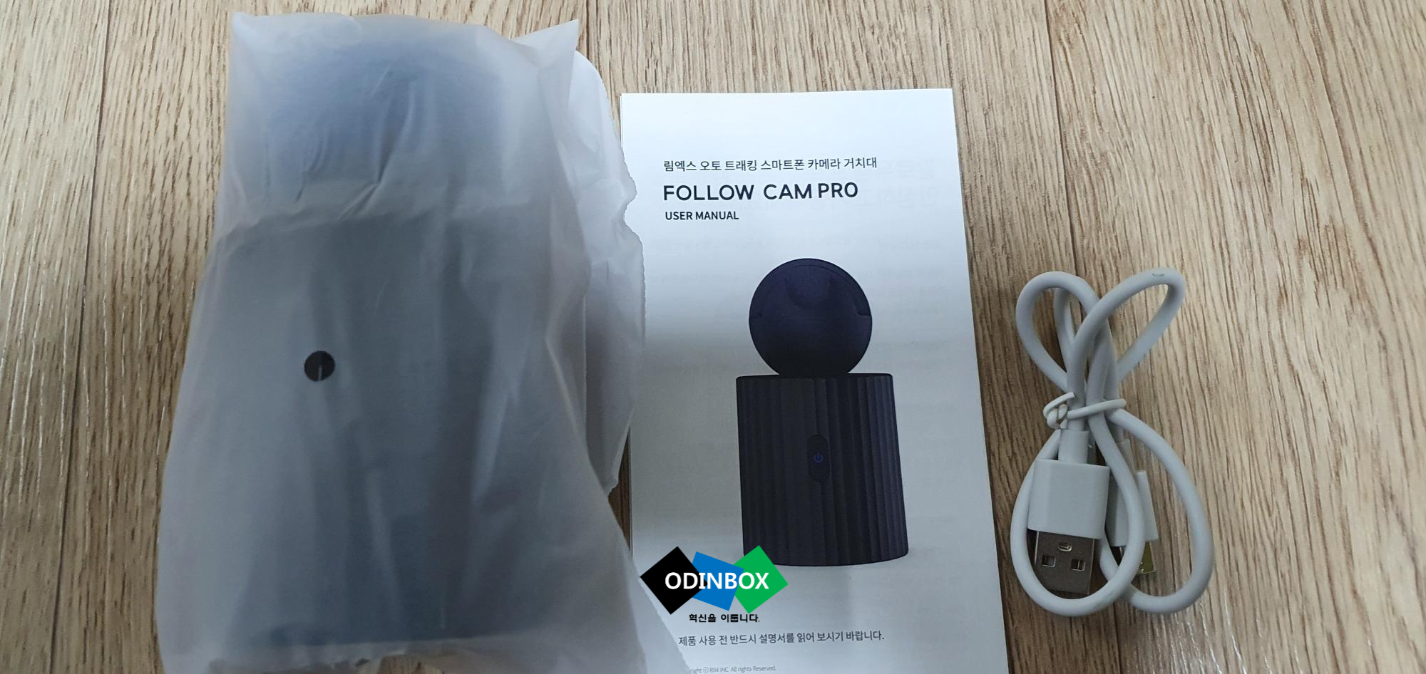 박스를 개봉하면 구성품으로는 C-Type USB 케이블 하나와 팔로우캠 프로 본품 그리고, 사용설명서가 있습니다. 본품의 마감 상태와 퀄리티는 생각보다 좋습니다. 본품에는 USB 충전 포트와 삼각대 연결하는 곳이 있고 전원버튼 있습니다. 상단 부분에 스마트폰을 연결하여 촬영하는 방식입니다. 삼가대는 상자를 열어보니 비닐로 포장이 되어져 있습니다. 실제 삼각대를 보니 꽤 튼튼하고 고정도 절됩니다. 삼각대 상단에 팔로우캠 프로를 연결하여 사용하면 됩니다.