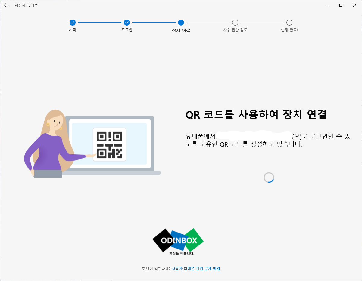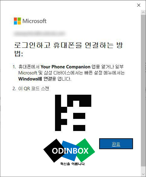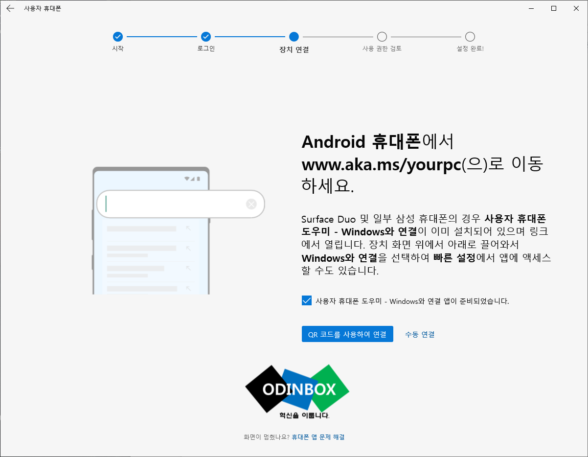 해당 화면에서 사용자 휴대폰 도우미 - Windows와 연결 앱이 준비되었습니다. 를 선택하고 하단에 QR 코드를 사용하여 연결을 누릅니다.