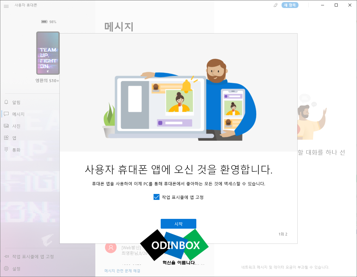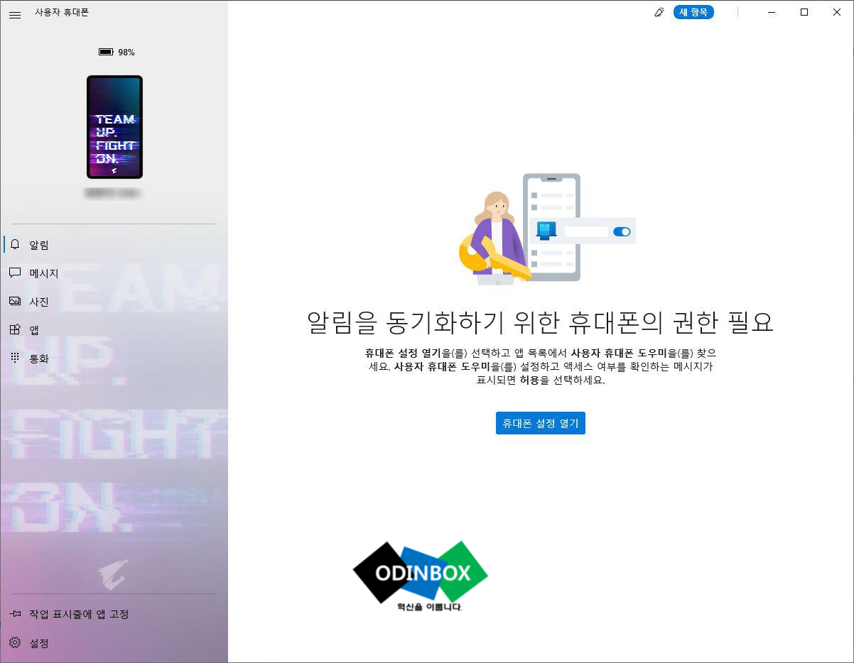 배터리와 함께 스마트폰 설정된 이름이 나오게 되고 왼쪽 메뉴는 각각 알림은 휴대폰에 온 알림을 바로 볼 수 있고, 메세지의 경우 내 스마트폰에 온 메세지를 볼 수 있습니다. 메세지 발송도 가능합니다. 그리고, 사진의 경우 스마트폰에 있는 사진을 다 볼 수 있도록 되어 있고, 앱의 경우 스마트폰에 설치된 앱을 실행하거나 스마트폰 화면을 실시간으로 볼 수 있는 미러링을 할 수 있습니다. 통화는 PC로 전화를 걸 수 있고 수신된 전화를 받을 수 있습니다.