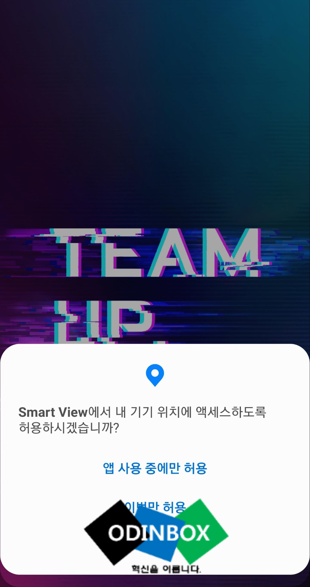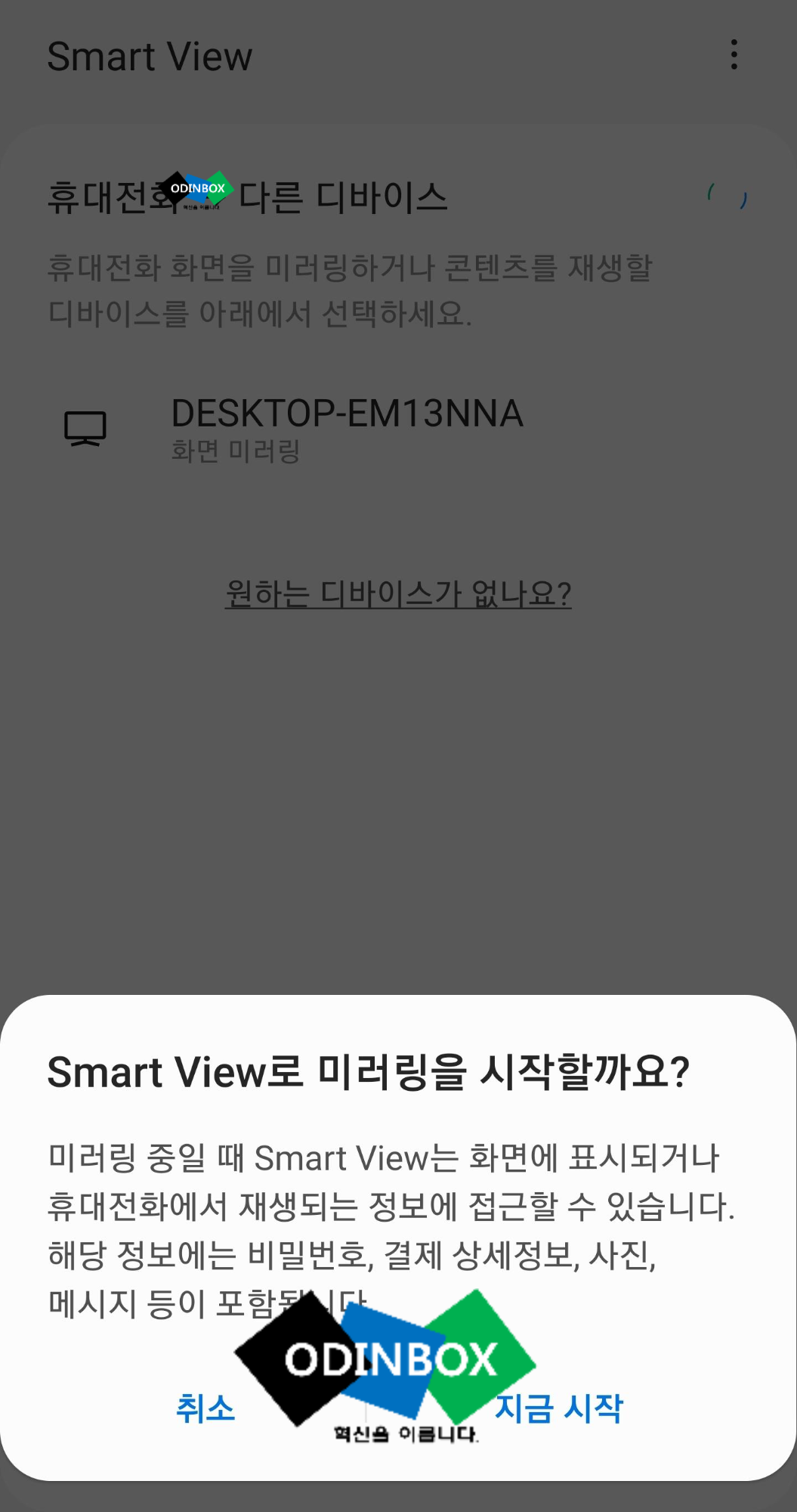 첫 사용 시 권한을 허용해야 한다는 알림 창이 나옵니다. 위치정보를 위해 앱 사용 중에만 허용을 누른 후 SmartView에서 잠시만 기다리면 목록에서 아까 PC 화면에 나왔던 내 컴퓨터 이름이 뜹니다. 누르게 되면 시작한다는 안내와 함께 지금 시작을 누르면 연결 중이 뜨고 잠시 후 PC 화면에는 연결한 스마트폰 화면이 나오게 되며 컴퓨터의 키보드로 스마트폰을 제어할 수 있습니다.