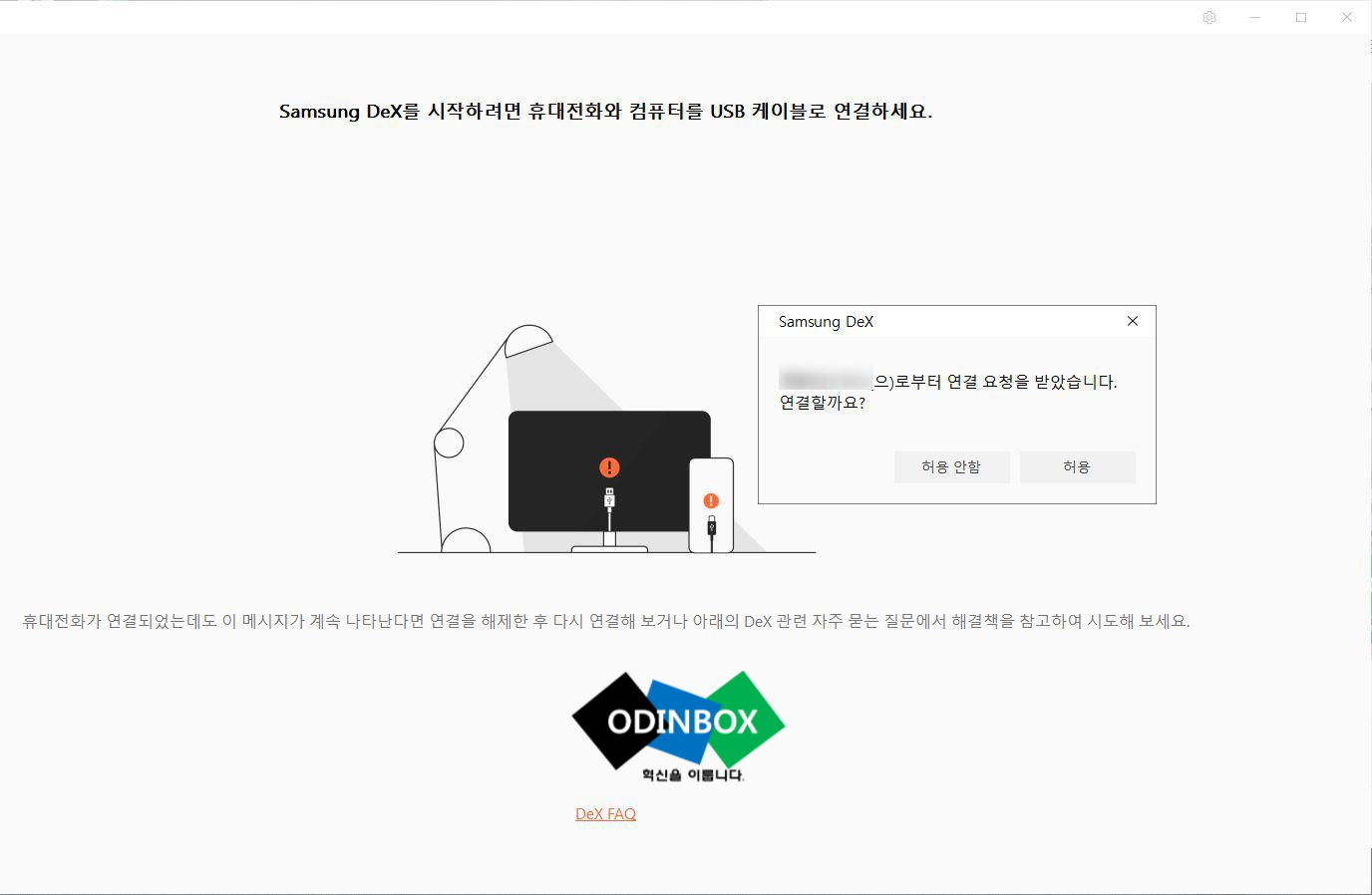 PC DeX를 보시면 알림 창이 하나 뜹니다. "OOO(으)로부터 연결 요청을 받았습니다. 연결을 할까요?"라는 안내 창이 뜨고 하단 부분 허용을 누른 후 잠시만 기다리면 해당 화면이 나오게 되고 스마트폰 화면을 사용할 수 있게 됩니다. DeX를 이용하면 TV나 모니터로 바로 연결을 할 수 있습니다. 단, 지원을 하는 기계가 있으니 미리 확인을 하고 이용을 하시면 됩니다.