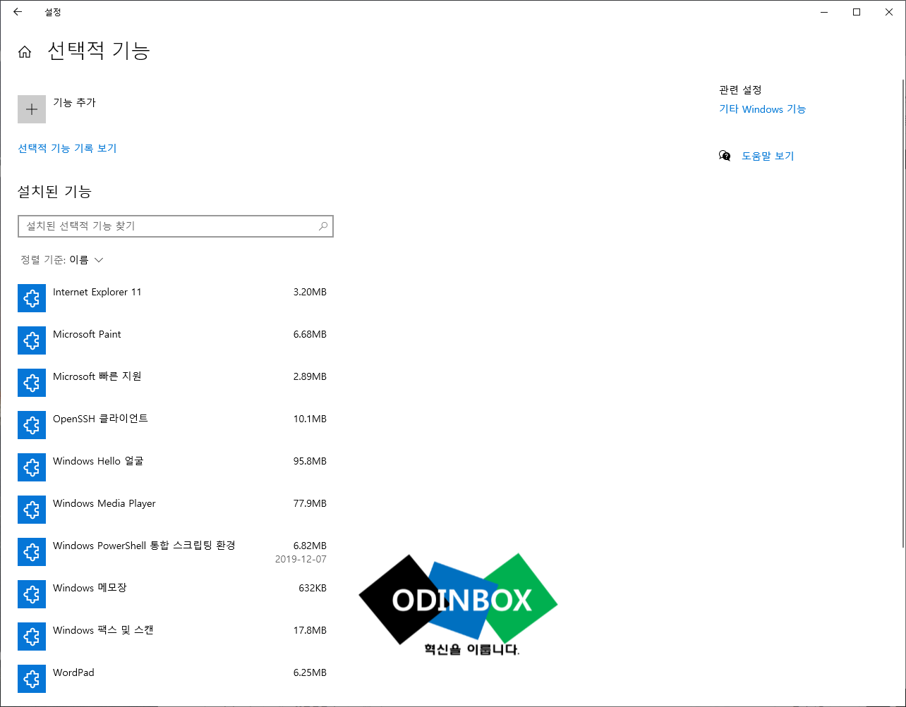 선택적 기능 중 설치된 기능은 아래의 목록에서 검색 또는 표시가 됩니다.
