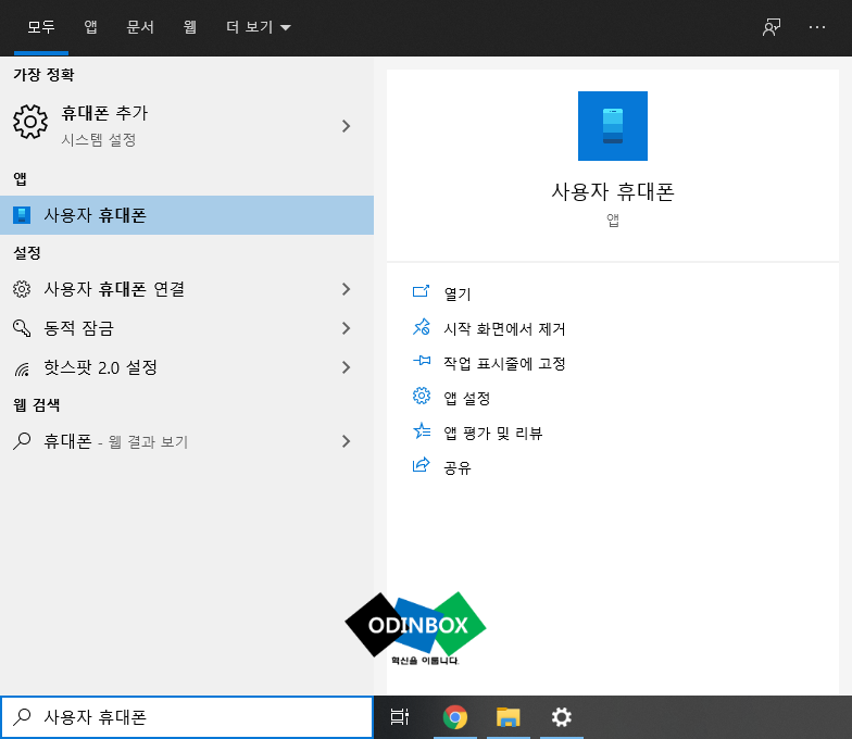 해당 방법을 이용하려면 시작표시줄에 검색창을 이용해야 합니다. "검색하려면 여기에 입력하시오." 부분을 누른 후 휴대폰이라고 검색하면 아래와 같이 앱이 표시가 됩니다.