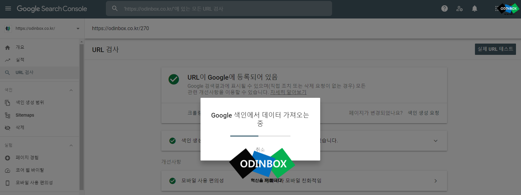 해당 주소가 정상적으로 구글에 등록이 되어있는지 확인을 할 수 있고, 색인 생성 범위와 함께 모바일 사용 편의성을 알 수 있습니다. 그리고 상단 부분 오른쪽에 실제 URL 테스트를 누르면 약 1~2분 정도를 걸리면 테스트가 완료가 됩니다.