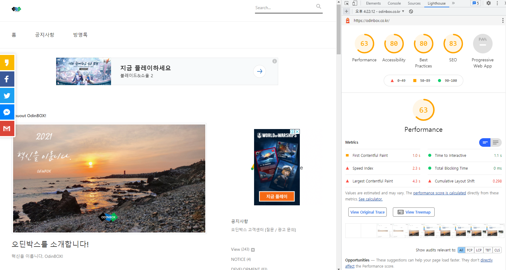 왼쪽은 모바일로 측정을 진행한 것이고, 오른쪽 사진은 PC(데스크톱)으로 측정을 진행했습니다. 둘 다 점수가 크게 높지는 않지만 모바일 측정은 Performance(성능)은 형편없는 점수가 나왔습니다. 다른 점수들도 그렇고 왜 이런 점수가 나왔는지는 스크롤을 내리면 각각 다 알 수 있습니다. 왜 여기서 이런 점수가 나왔는지에 대해서 알 수 있어 대응할 수 있도록 되어있어 편의가 좋습니다.