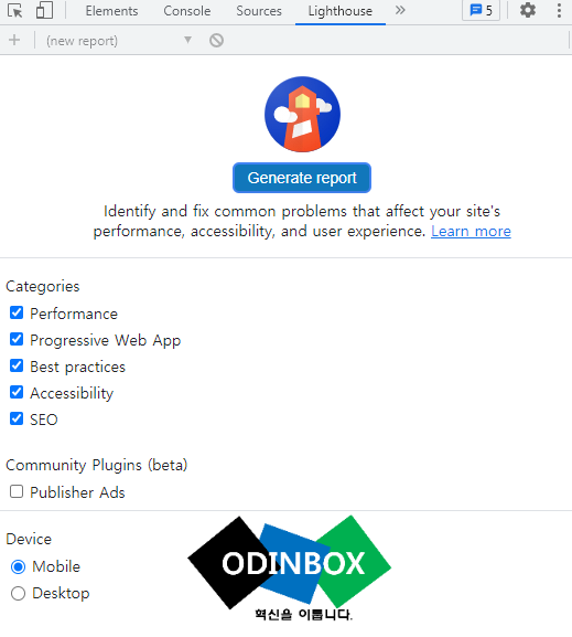 상단 부분 탭에서 LightHouse가 보이지 않는다면 >>버튼을 누른 후 LightHouse를 누르면 됩니다. 그리고 자신이 원하는 항목을 누른 후 Generate report를 누르면 자동으로 웹의 성능을 측정한 후 보고서를 바로 볼 수 있습니다. 항목별로 정보는 아래와 같습니다.