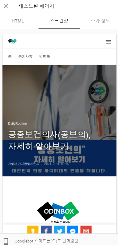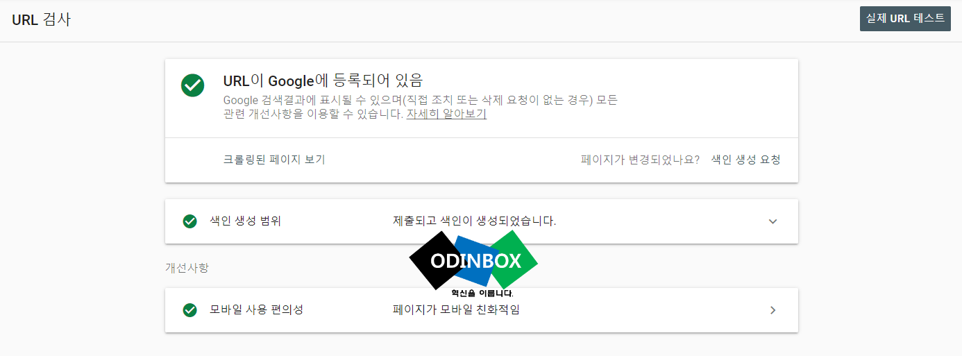 해당 주소가 정상적으로 구글에 등록이 되어있는지 확인을 할 수 있고, 색인 생성 범위와 함께 모바일 사용 편의성을 알 수 있습니다. 그리고 상단 부분 오른쪽에 실제 URL 테스트를 누르면 약 1~2분 정도를 걸리면 테스트가 완료가 됩니다.