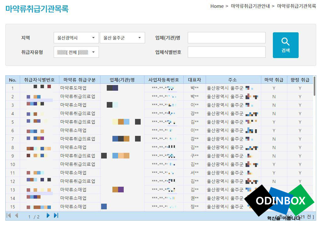 지역을 검색을 하면 위와 같이 조회가 가능합니다. 취급자식별번호, 마약류 취급구분, 업체(기관)명, 사업자등록번호, 대표자, 주소, 마약취급, 항정 취급등을 확인을 할 수 있습니다.