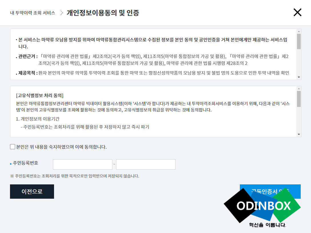개인정보이용동의를 누르고 주민등록번호를 입력한 후 공동인증서 인증버튼을 누르고 공동인증서로 확인을 하면 서비스를 이용할 수 있습니다.