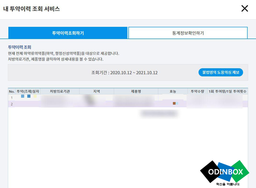 또한 통계정보확인을 누르게 되면 다양한 통계정보를 확인을 할 수 있어 더욱 편리하고 간단합니다. 혹시나 자신의 받은 의약품이 아닌데 조회가 될 경우 불법명의 도용 의심으로 꼭 제보를 하시길 당부드립니다.